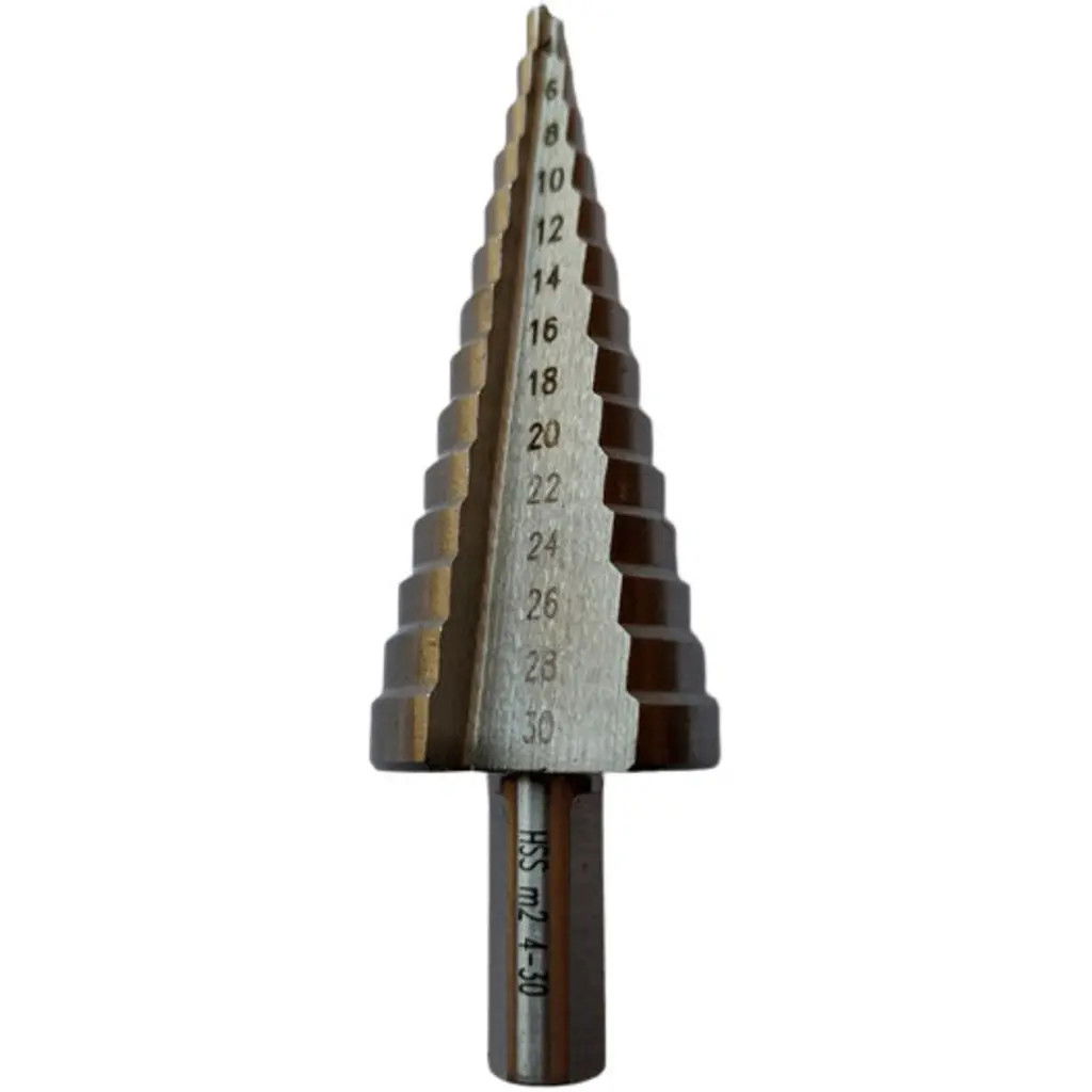 HSS M2 lépcsős fúró nagy teljesítményű, edzett gyorsacélból, hengeres szárral. Előfúrás nélkül, többféle furatátmérőhöz használható. Kiváló hő- és kopásállóság, sorja mentes fúrás nemvas fémekhez, acéllemezekhez, műanyagokhoz.